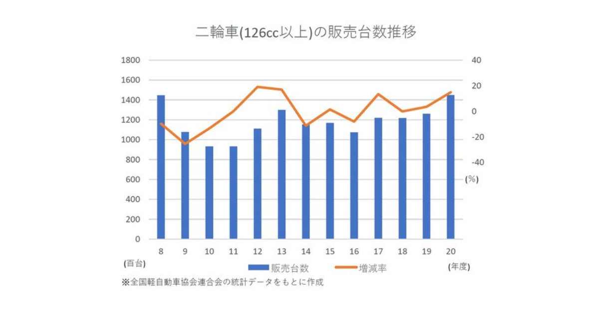 2010年までバイクの登録者数は、若者の人口増減と共に推移します。1990年までは増加し、その後2010年まで減り続けます。2010年で一旦下げ止まりとなり、その後は横ばいとなっています。2010年以降も若者の人数が減っていることを考えると、この頃にバイクの購入層が変化したことが分かります。専門家は、この変化をバイクが単なる移動の手段から趣味として使用されていると分析しています。リターンライダーの増加やSNSによりバイクが見直されたことが原因と言われています。微増します。以降はまで下がり続けます。増加とともに売り上げを伸ばしたピークを向かえた1990年代のバイクブーム終わり下がり続けてきた登録者数が2010年頃には下げ止まり、その後は年ごとの増減はありますが2010年は152万台、2021年は174万台と平均して1年で2万台のペースで増加しています。また、年間販売数も2010年から2020年の間で平均6万台となっています。販売数6万台と登録増加数2万台この差が廃棄数となります。2020年のデータを利用し廃棄率を計算してみると